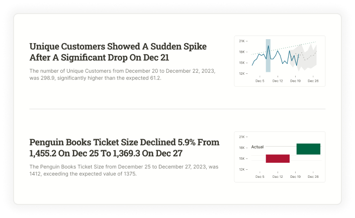 Babbage continuously delivers data insights to business leaders in a dynamic news feed rather than via a traditional static dashboard. Insights appear in a visual, easy-to-understand, mobile-friendly manner. Explanations are intuitive and visual. Monitored metrics are presented with context and trends.